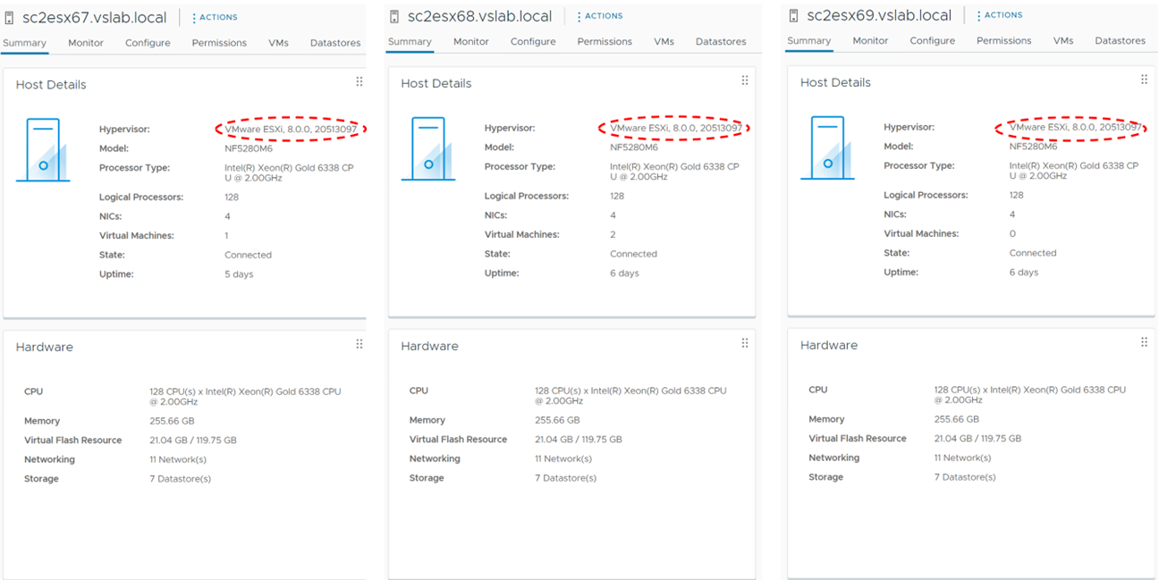 The 3 ESXi servers are Intel NF5280M6 Ice Lake Servers, each server has 2 sockets, 32 cores per socket, Intel(R) Xeon(R) Gold 6338 CPU @ 2.00GHz, with 256GB RAM.