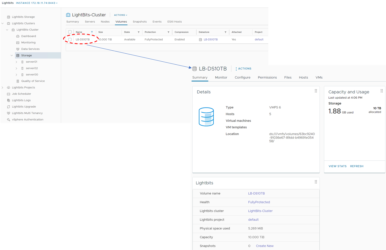 The 3 ESXi servers are connected to the Lightbits backed NVMe/TCP datastore.