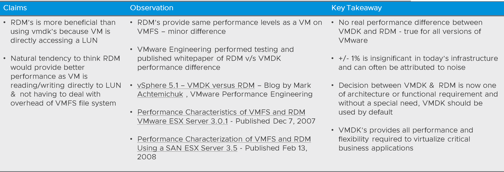 - The decision between VMDK and RDM is now one of architecture or functional requirement and without a special need, VMDK should be used by default.