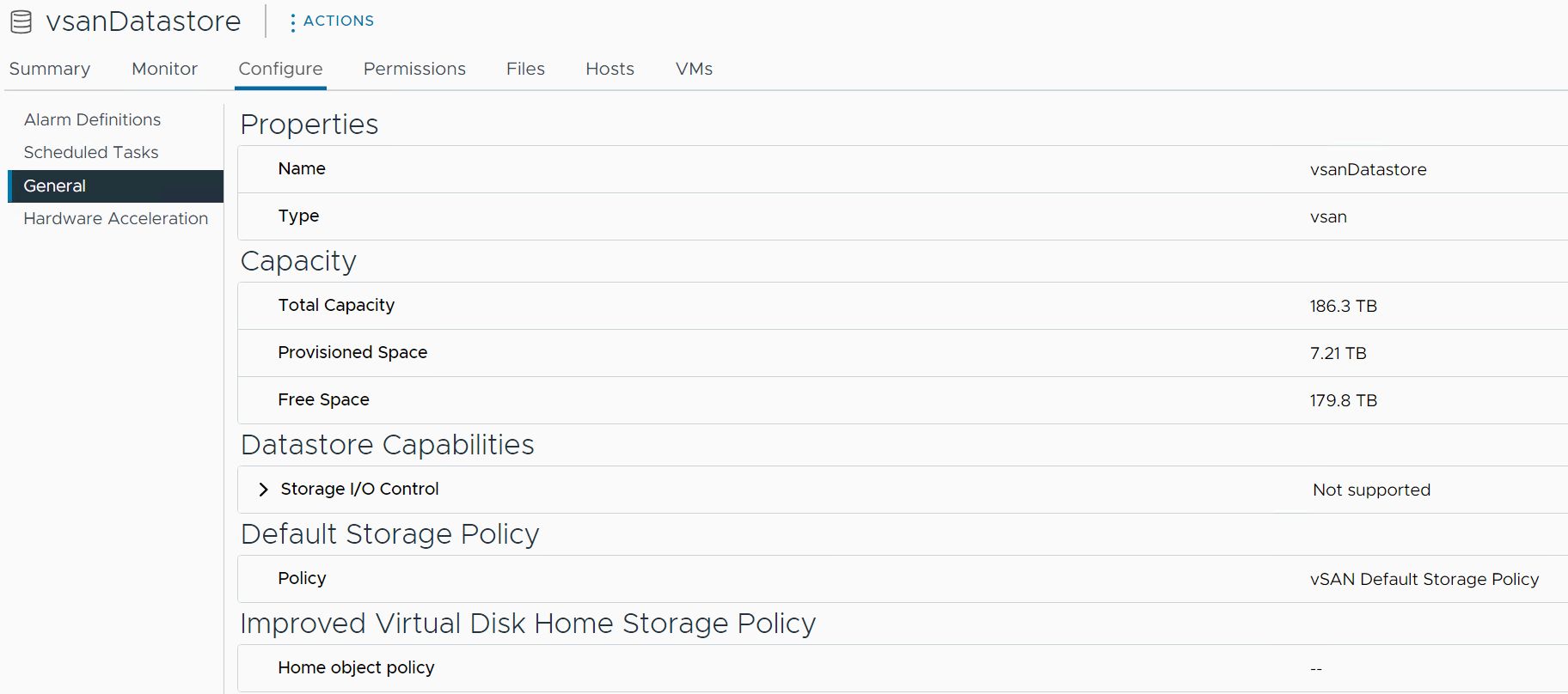 Details of vSAN Express Storage Architecture (ESA) cluster ‘env175’ are shown as below. The ESA Cluster has 8 Lenovo ThinkAgile VX7531 Node servers as shown below.