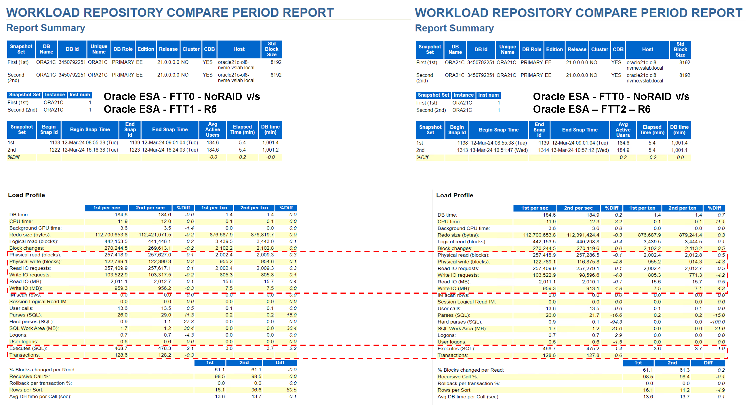 Diving deeper into core database load profiles, we see similar database metrics for Executes (SQL), Transactions, Read/Write IOPS and Read/Write MB/secs for both ‘Oracle ESA – FTT1 – R5’ and ‘Oracle ESA – FTT2 – R6’ storage policy runs