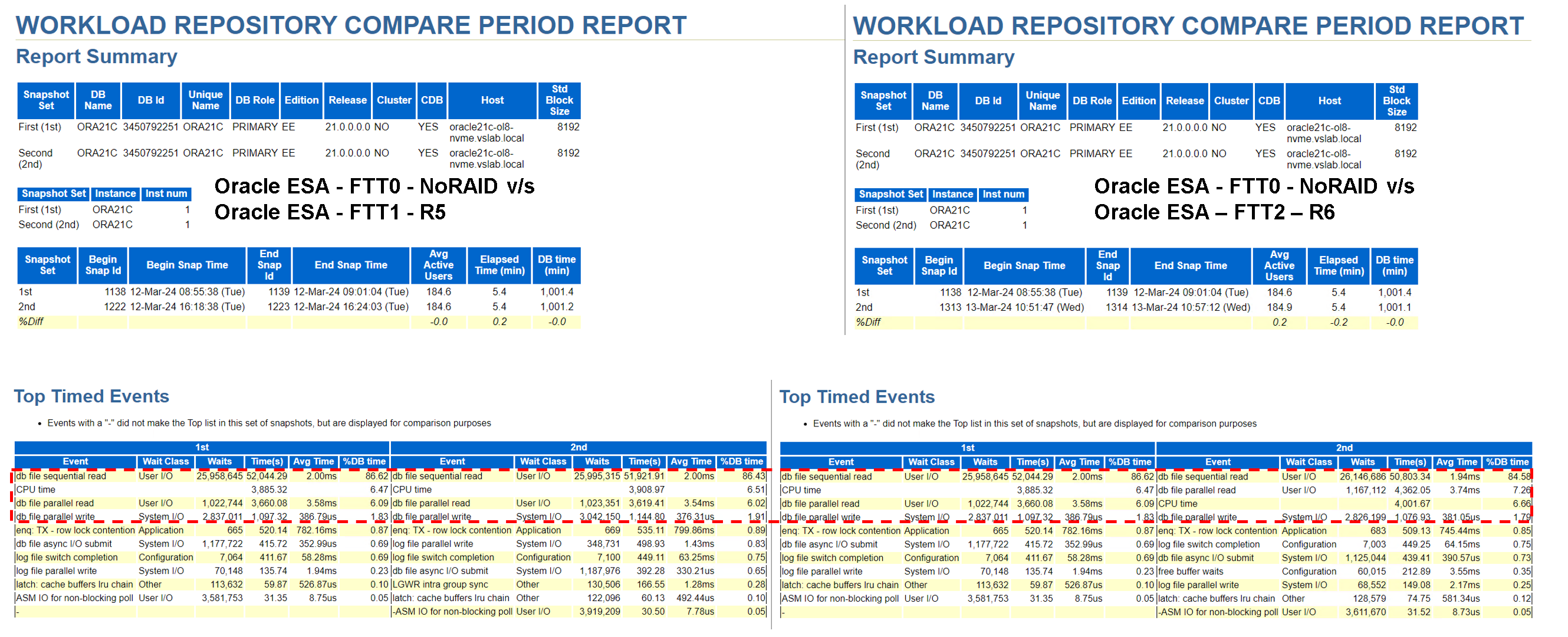 Diving deeper into core database wait events, we see similar database wait events with similar wait times for ‘Oracle ESA – FTT1 – R5’ and ‘Oracle ESA – FTT2 – R6’ storage policy runs.