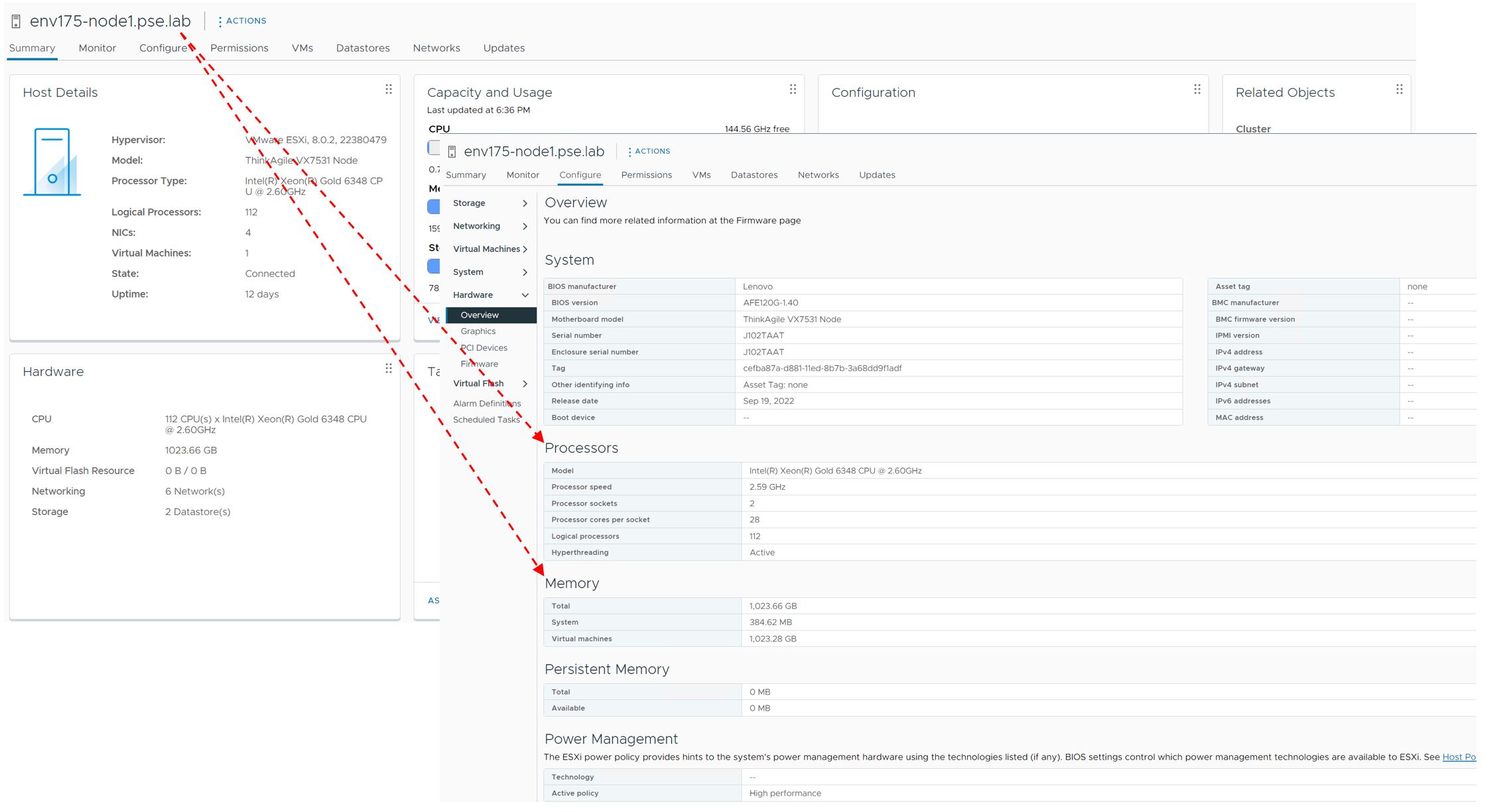 Each Lenovo ThinkAgile VX7531 server has 2 sockets, 28 cores per socket, Intel(R) Xeon(R) Gold 6348 CPU @ 2.60GHz, 1TB RAM as shown below.