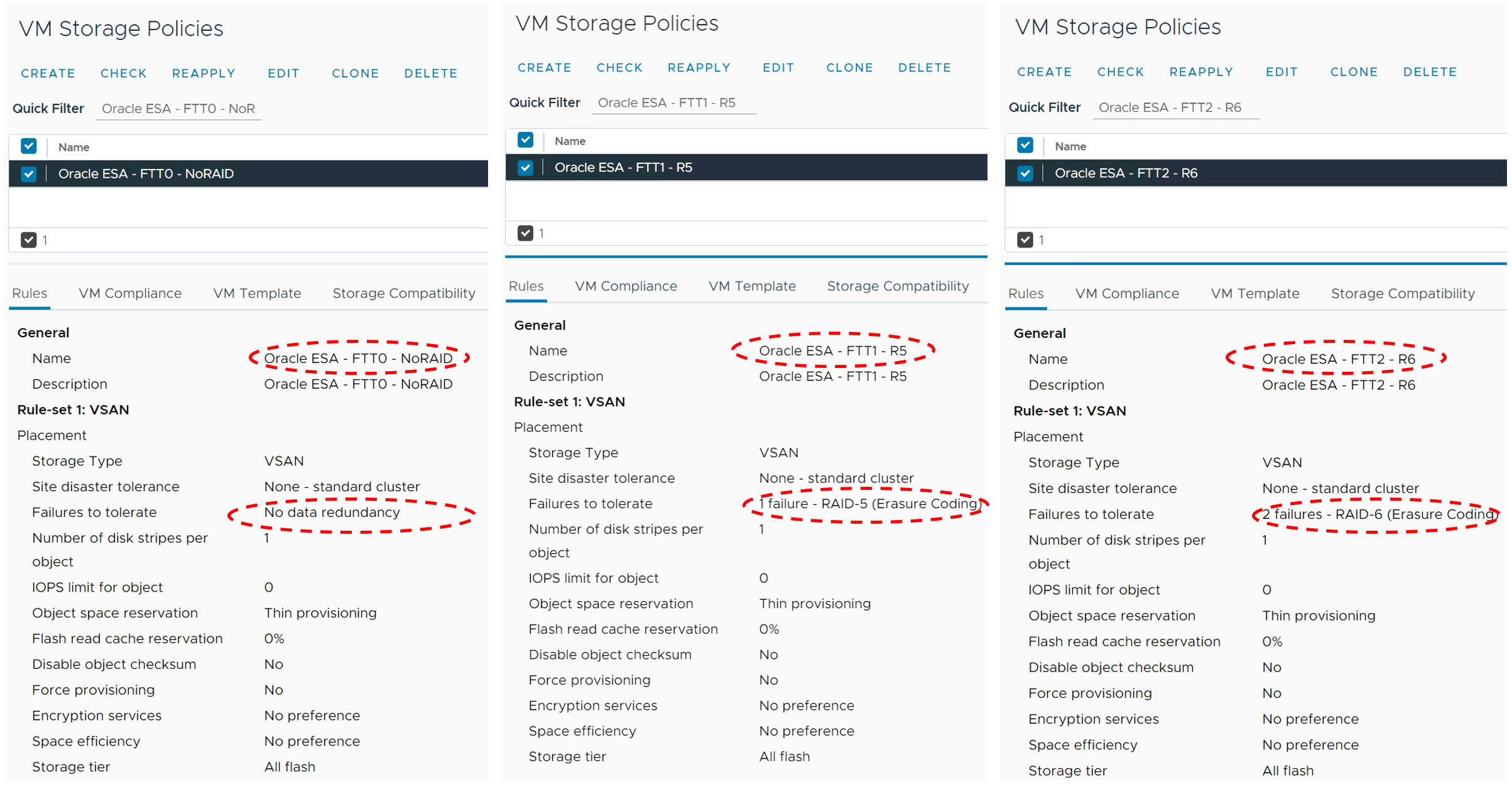 Baseline Oracle Policy ‘Oracle ESA – FTT0 – NoRAID´ was created to JUST get baseline metrics for comparison purposes, besides that, no true production workload is ever setup with FTT=0 (Failures to Tolerate) and No RAID (no protection.