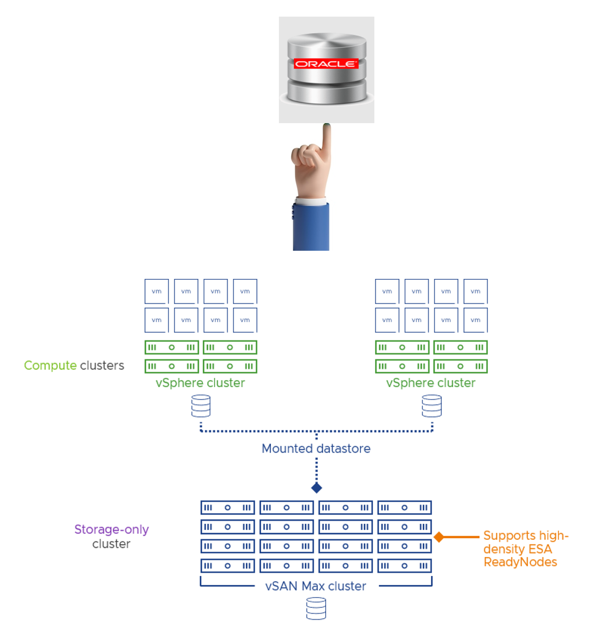 This blog is an exercise to showcase the advantages of using vSAN Max Storage for business-critical production Oracle workloads for regular use cases provided by traditional storage arrays along with providing incremental scalability, performance, and management capabilities that are associated with HCI – Simplicity with Performance, Scalability and Centralized Management.
