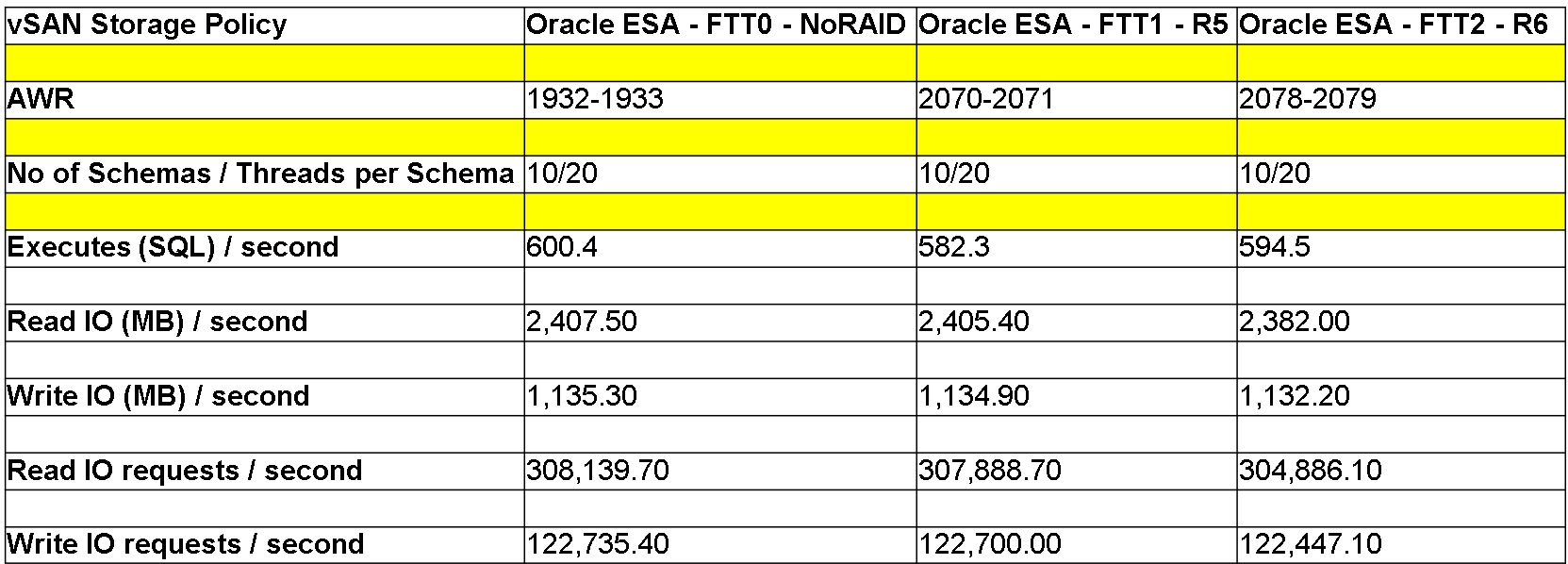 - Test 3 – Test run was with ALL vmdk’s with Storage Policy ‘Oracle ESA – FTT2 – R6’