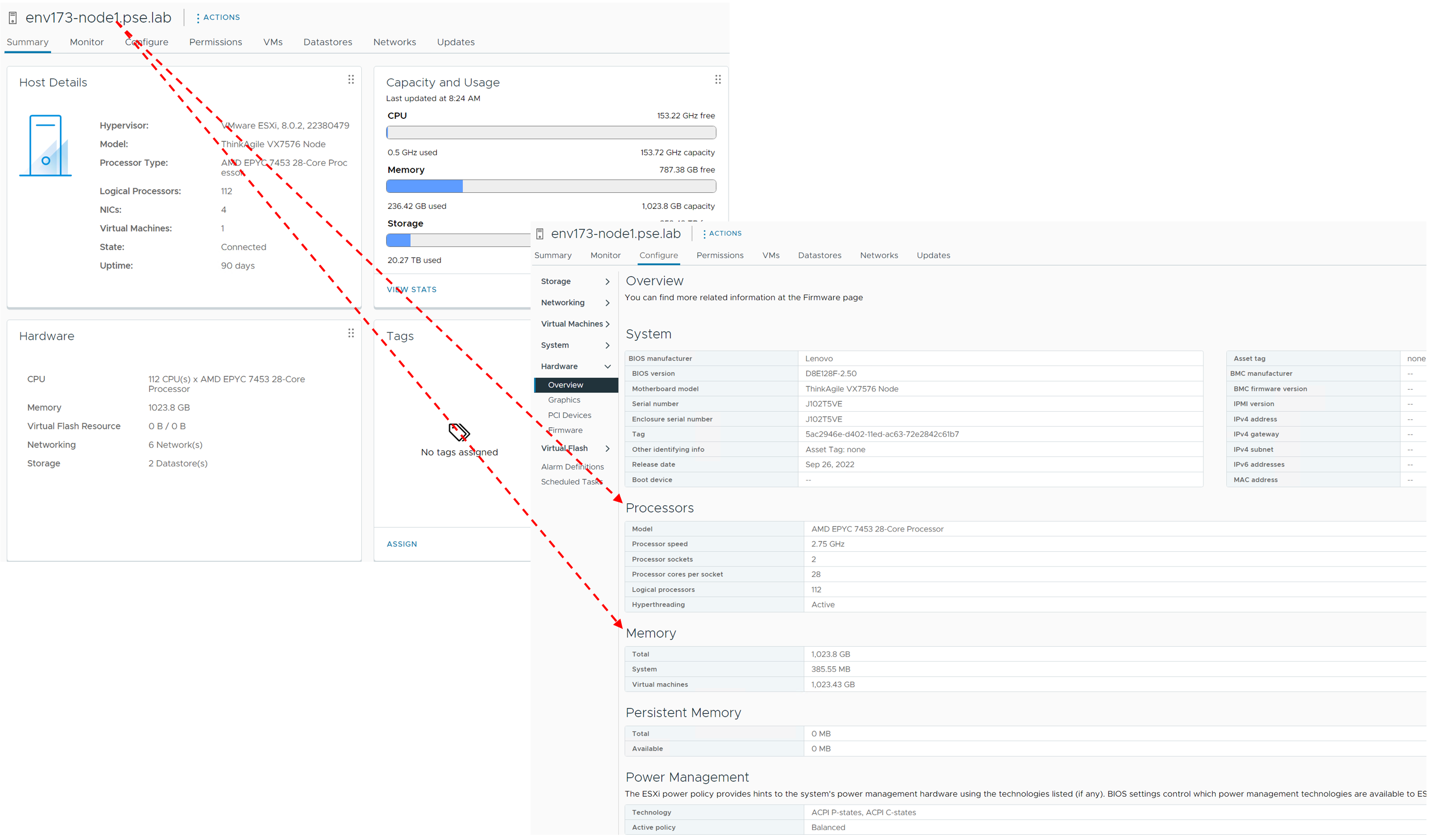 Each Lenovo ThinkAgile VX7531 server has 2 sockets, 28 cores per socket, Intel(R) Xeon(R) Gold 6348 CPU @ 2.60GHz, 1TB RAM as shown below.