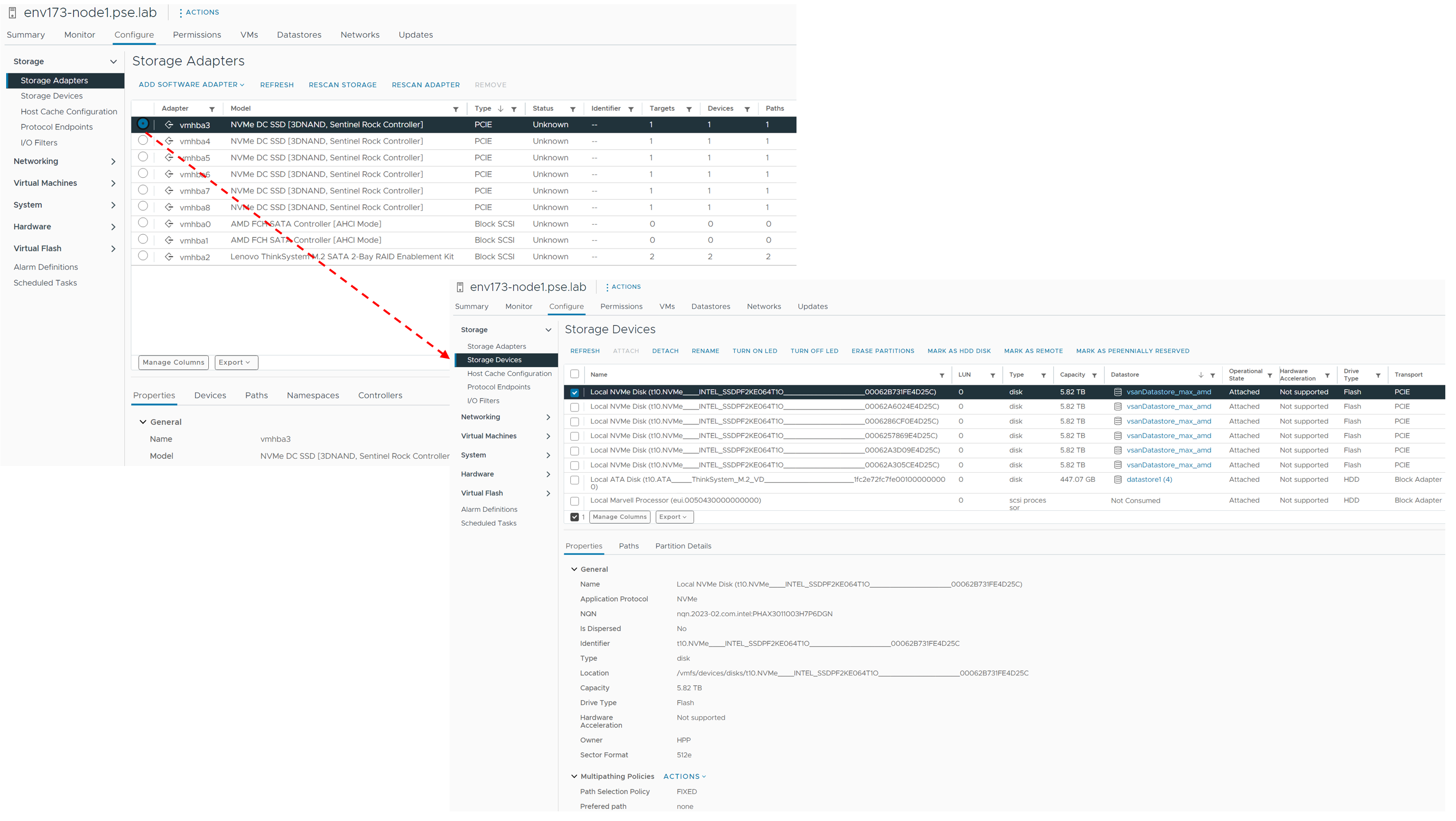 Lenovo ThinkAgile VX7576 server ‘env173-node1.pse.lab’ HBA & Internal NVMe drive details are as shown below.